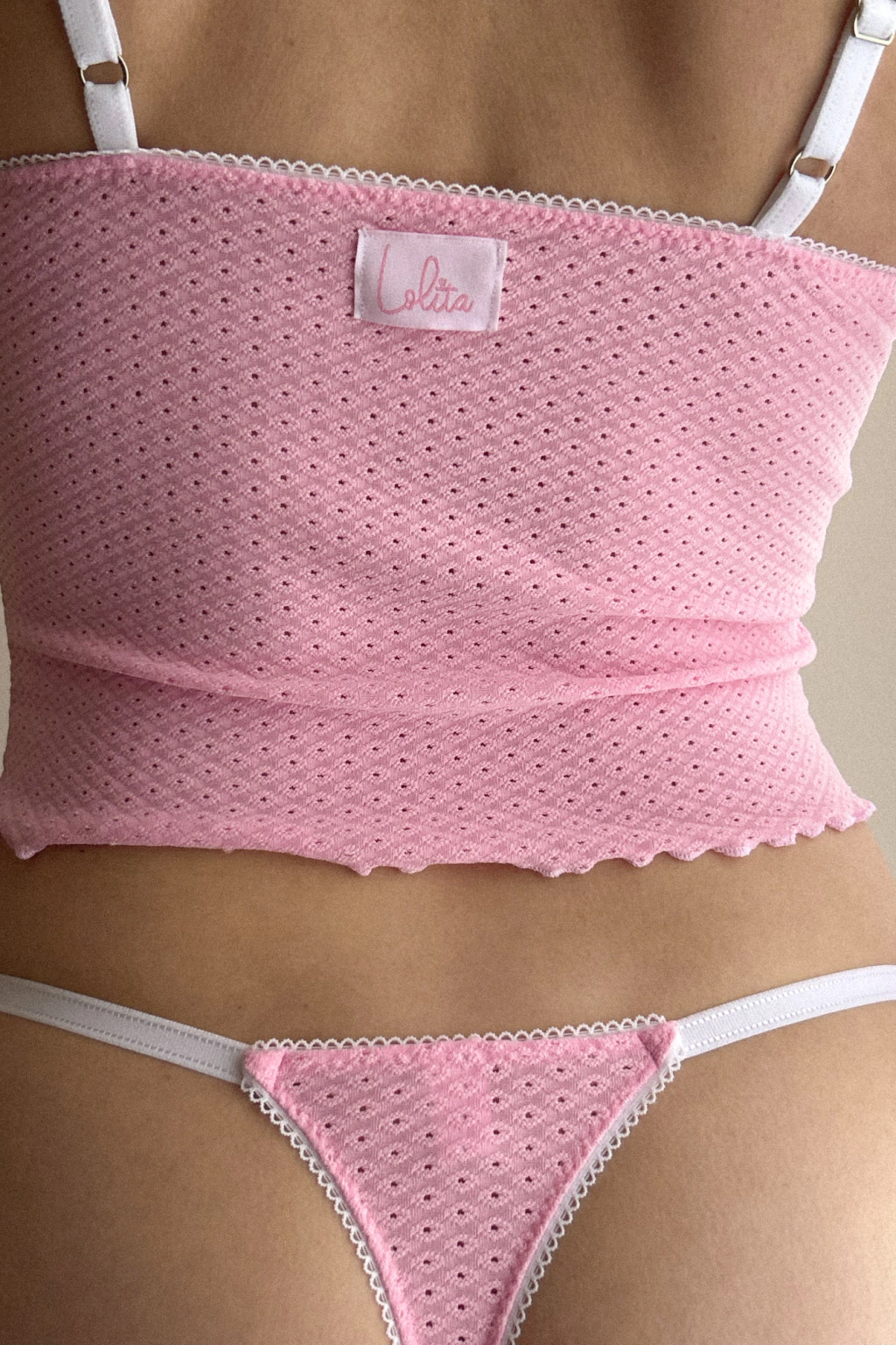 - Material y características: Realizado en broderie elastizado. Tiene detalles en puntilla con cinta de razo, es tiro medio y los elásticos son regulables. Las arandelas y correderas son metálicas (si sos alérgica al metal, podés avisarnos y las cambiamos por plásticas).